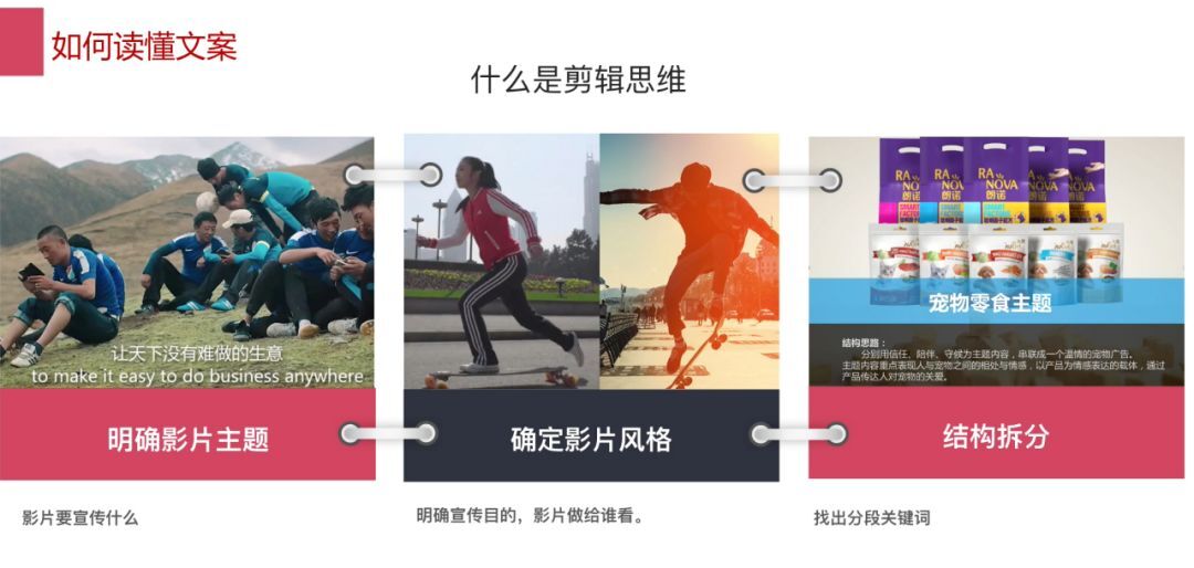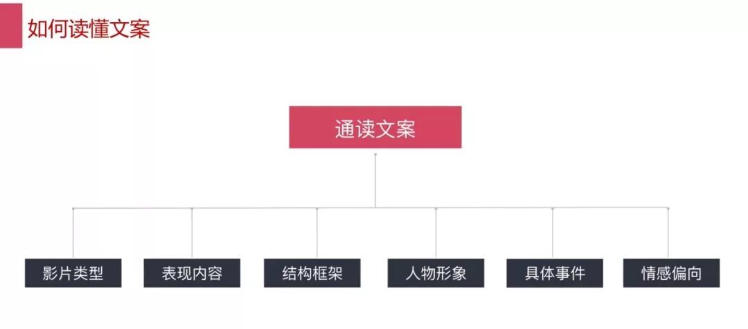 對于廣告宣傳片來說,我們拿到一個文案之后需要整體讀幾遍,大致了解這個片子是什么類型、講了什么內(nèi)容,結(jié)構(gòu)是什么,有什么人物、時間要求和場景,表達哪類情感等,這就和做閱讀理解一樣,你需要把主線提取出來。