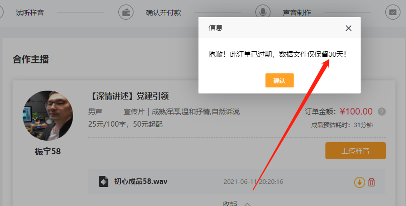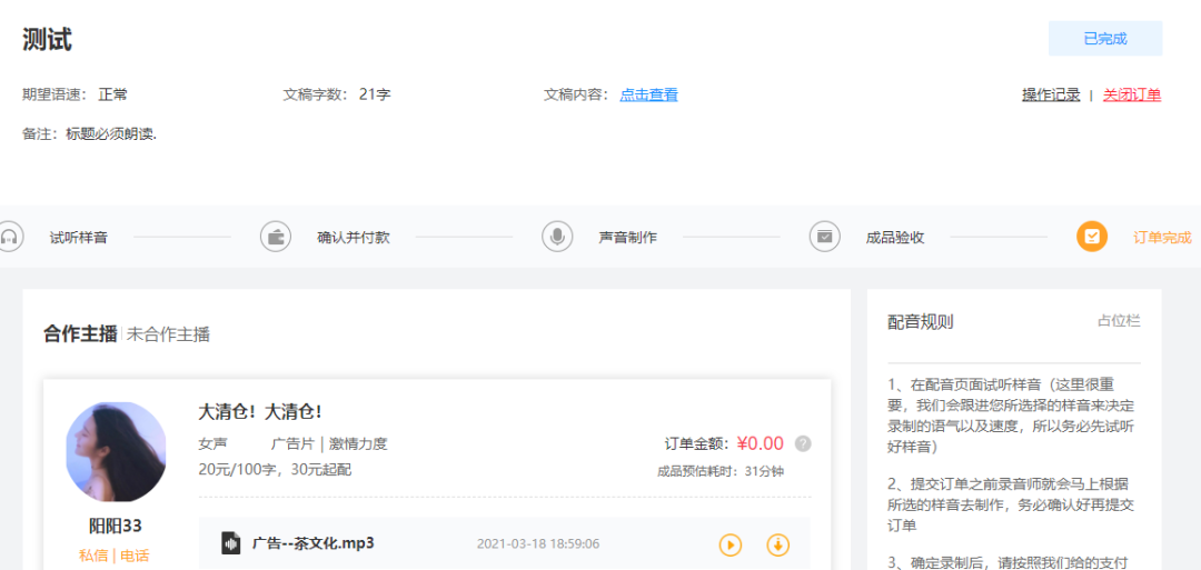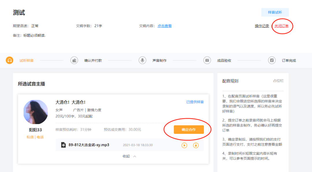 如果覺得樣音不錯(cuò),就直接點(diǎn)擊確認(rèn)合作進(jìn)行下單制作。如果試聽的樣音不是自己想要的,可以選擇點(diǎn)擊右上角的‘關(guān)閉訂單’進(jìn)行關(guān)閉,重新選擇要試聽的主播。